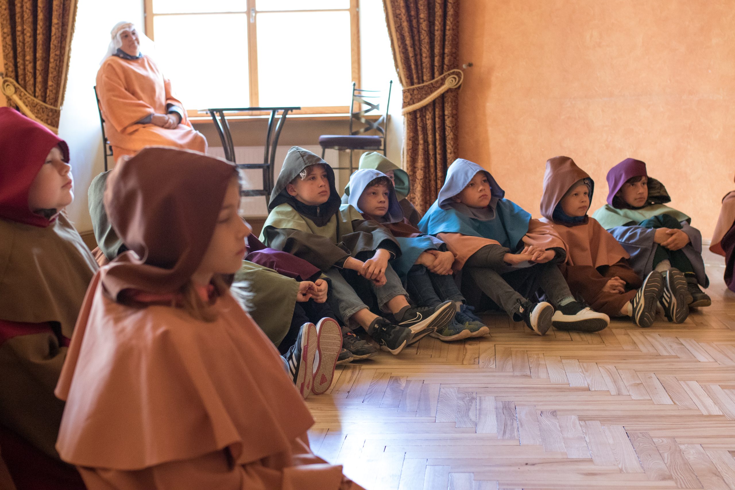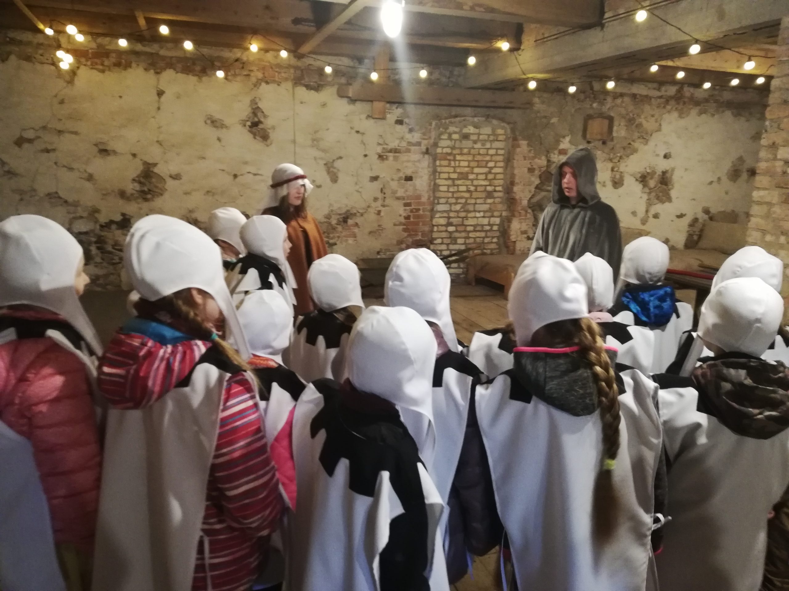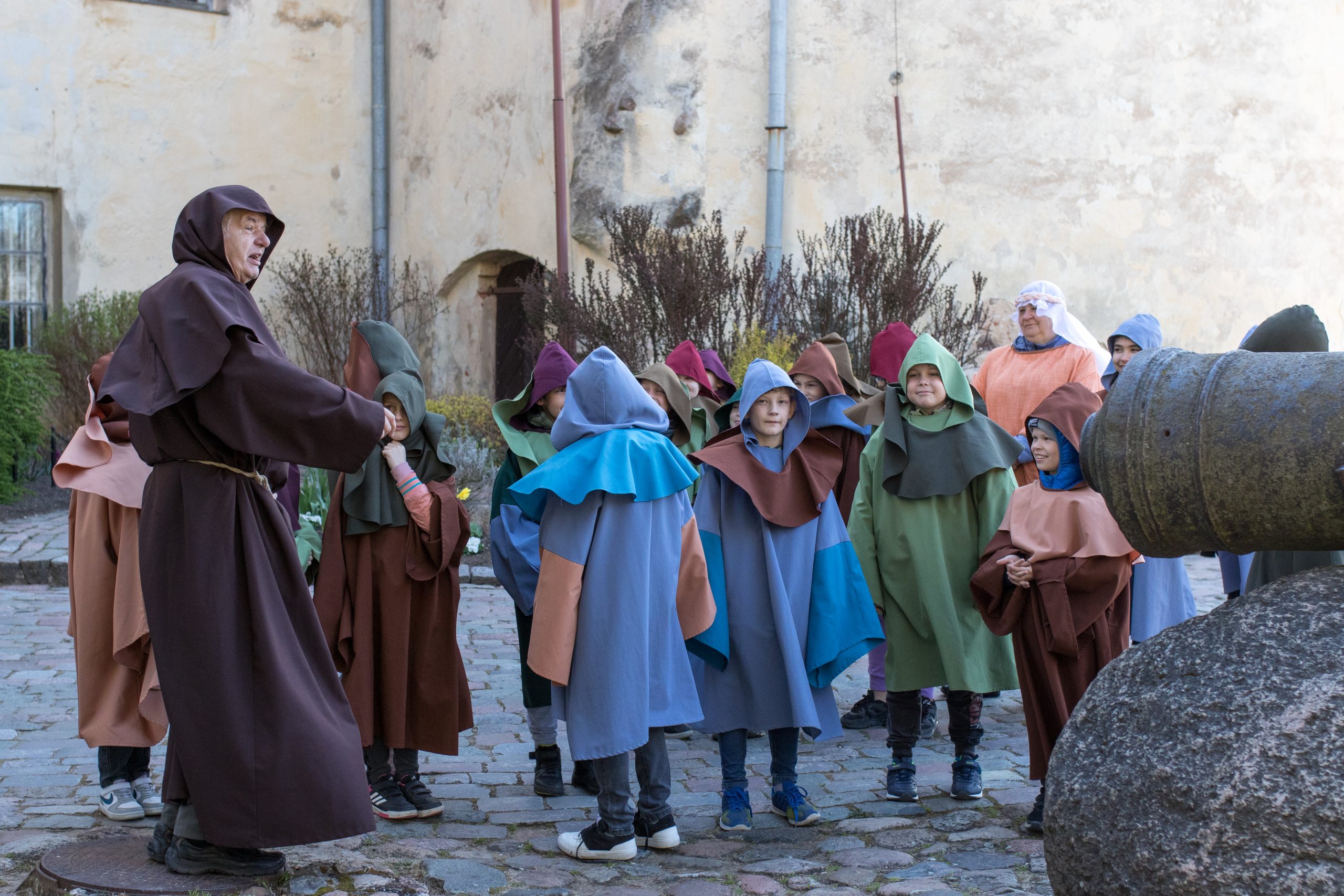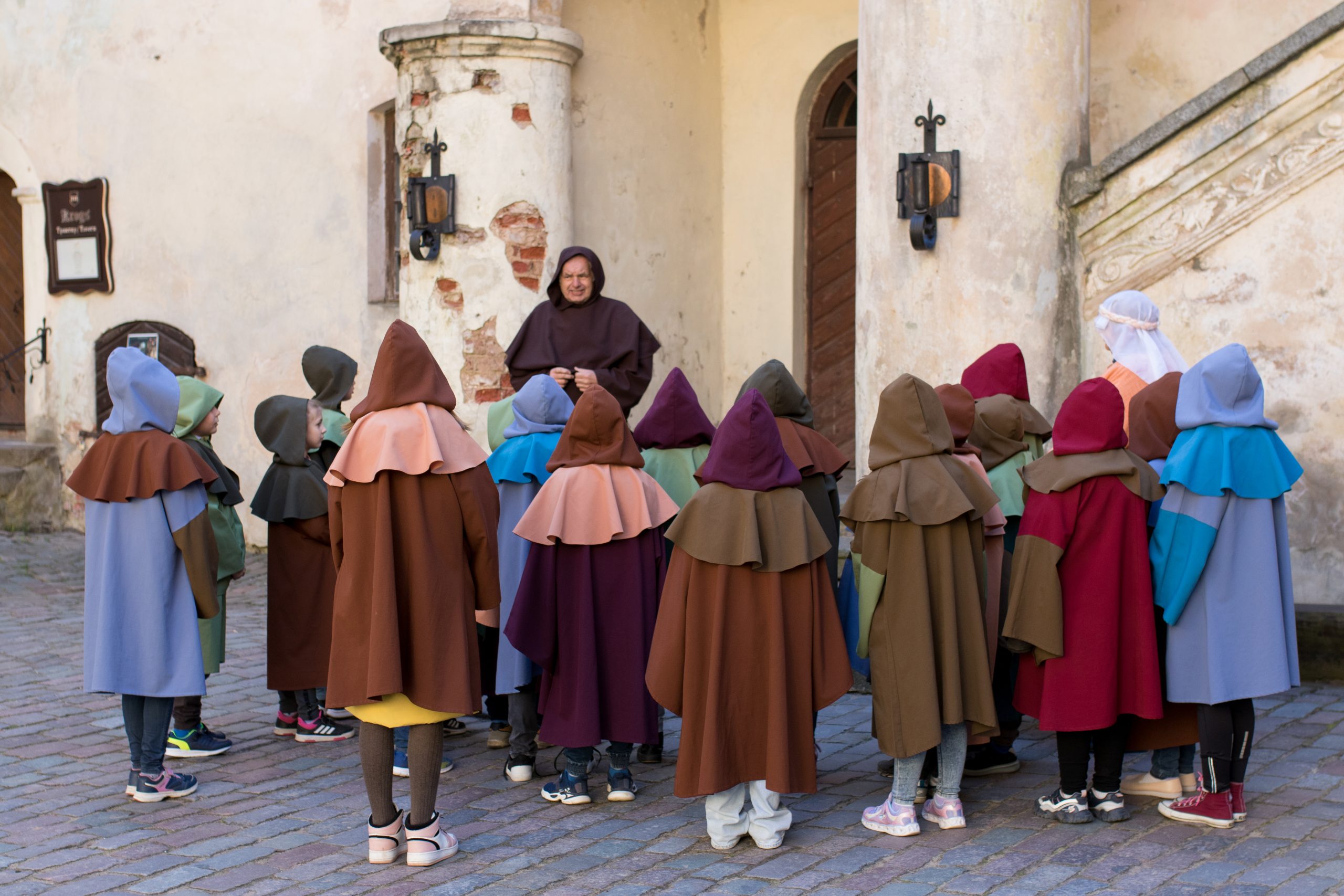 Mūks ar kalponīti izved bērnus mazo mūciņu tērpos cauri pilij, izspēlējot seno viduslaiku skoliņu, apgūstot iemaņas ieroču atpazīšanā un iemācoties tā laika pieklājības likumus.