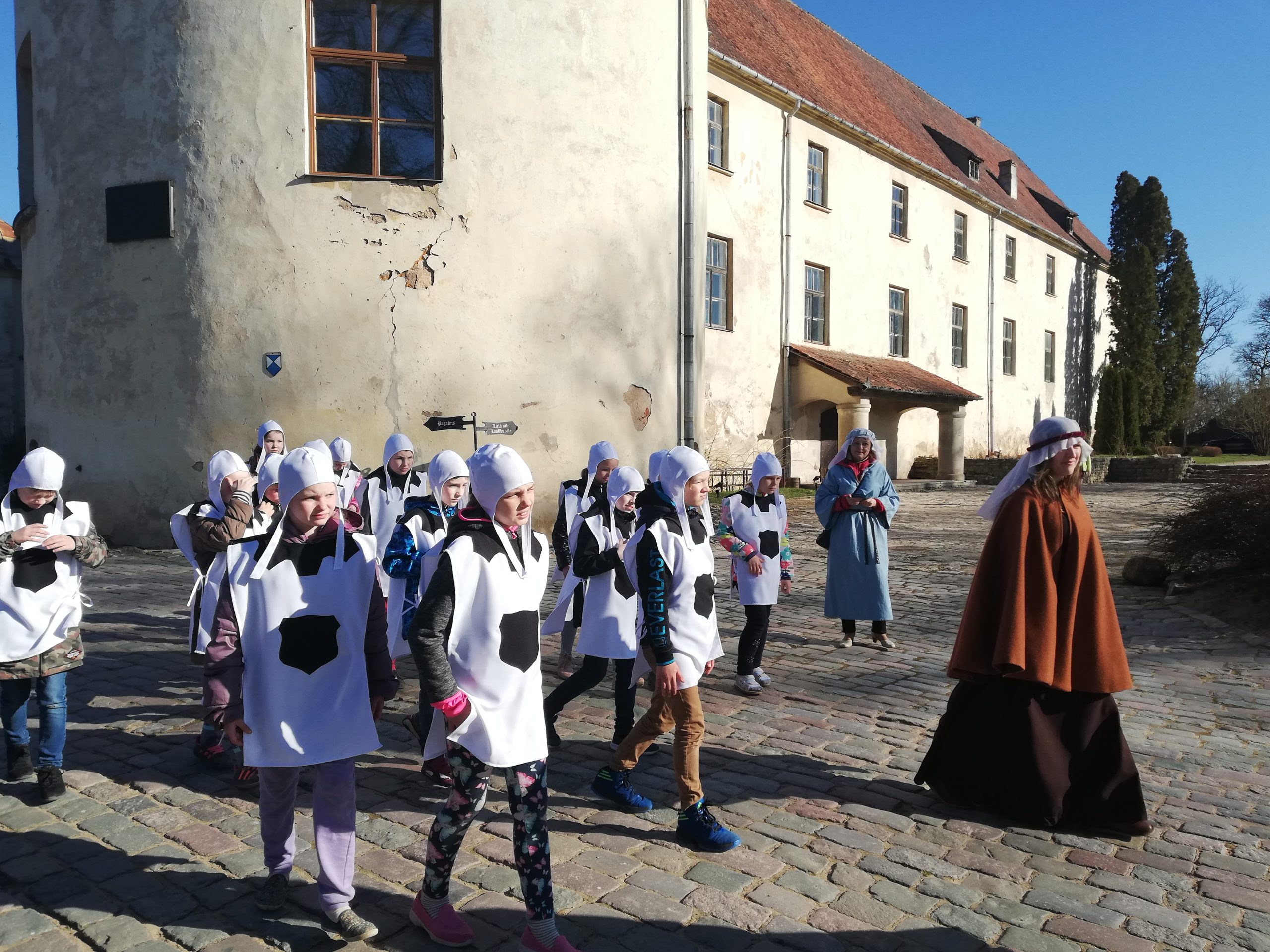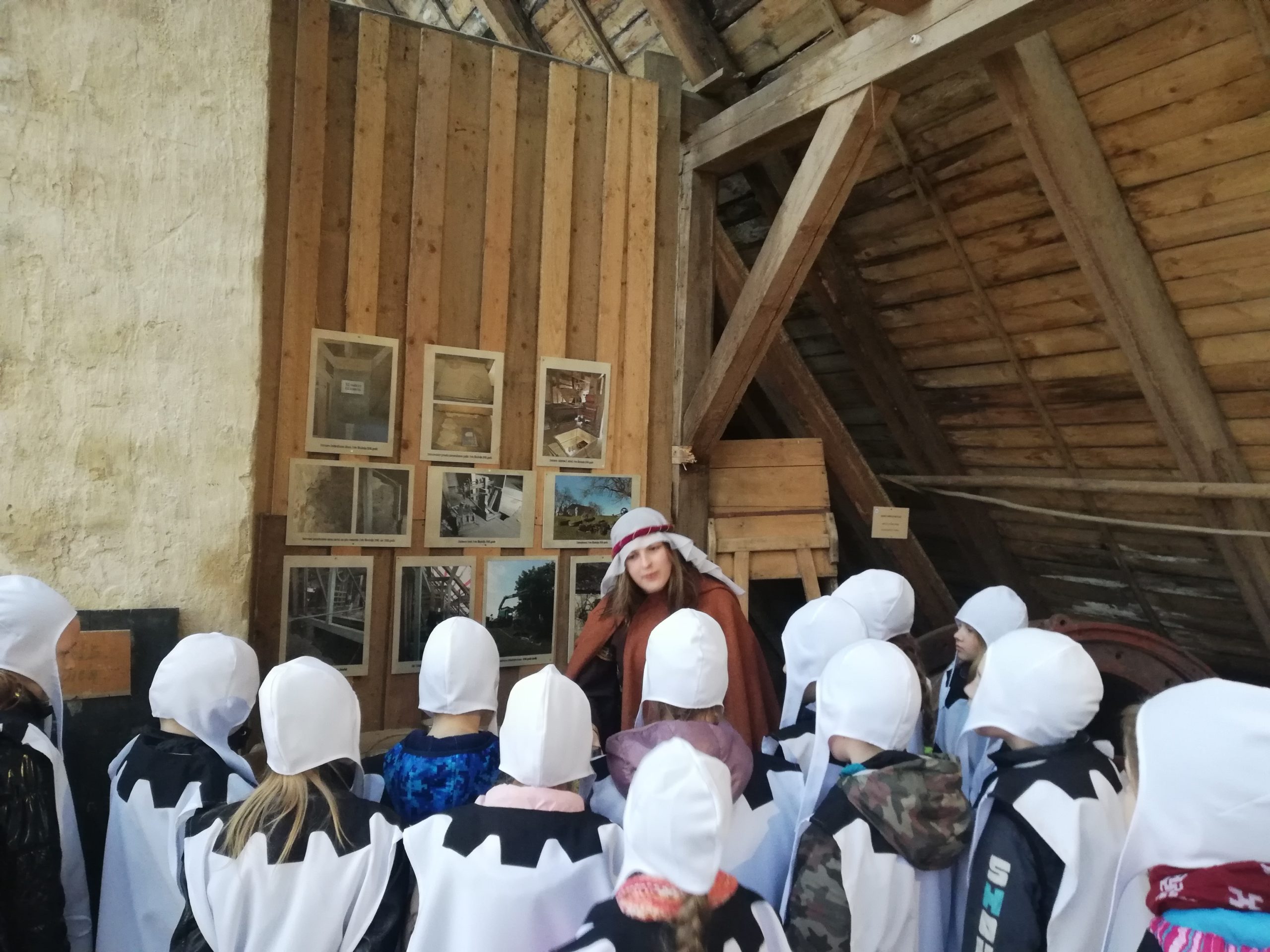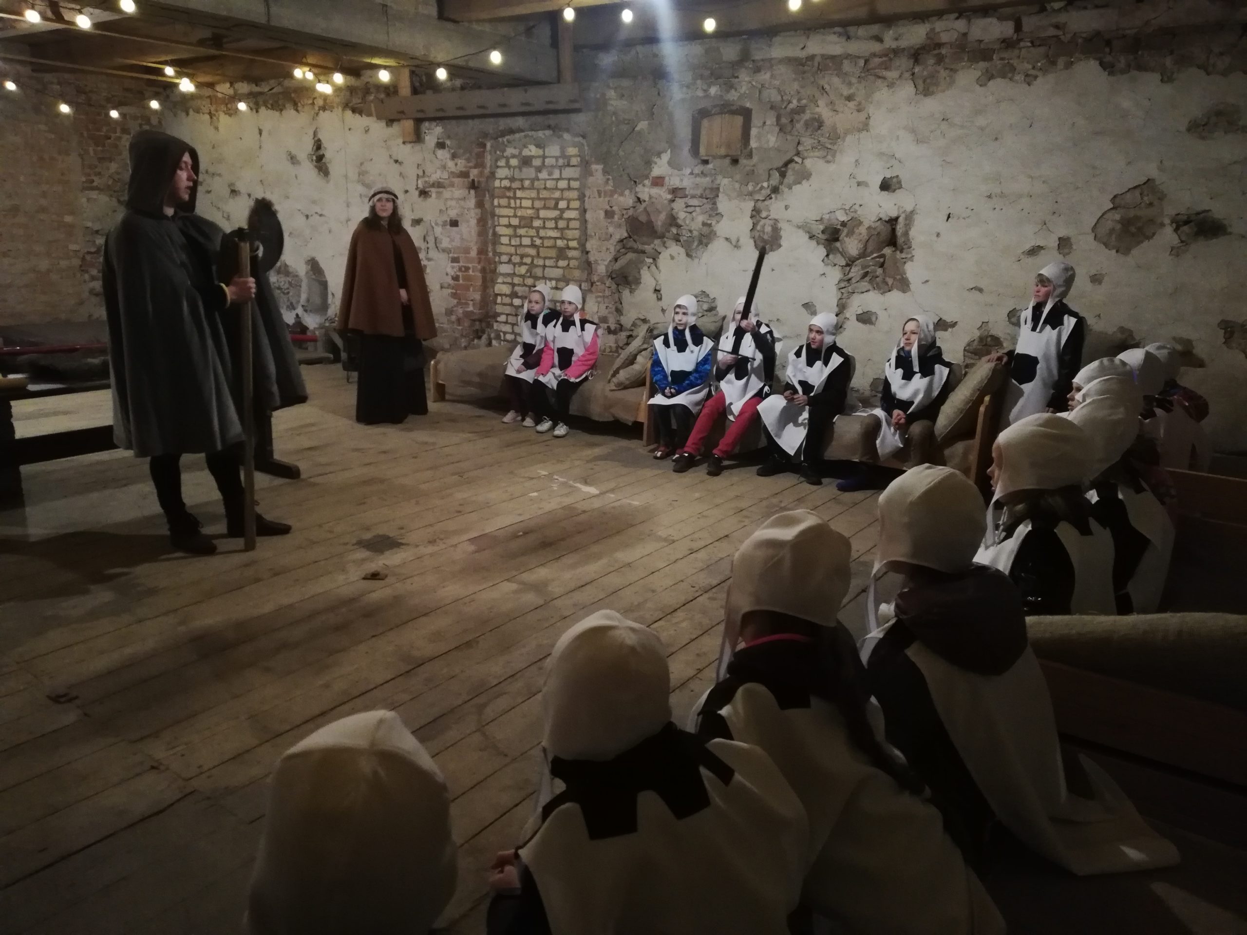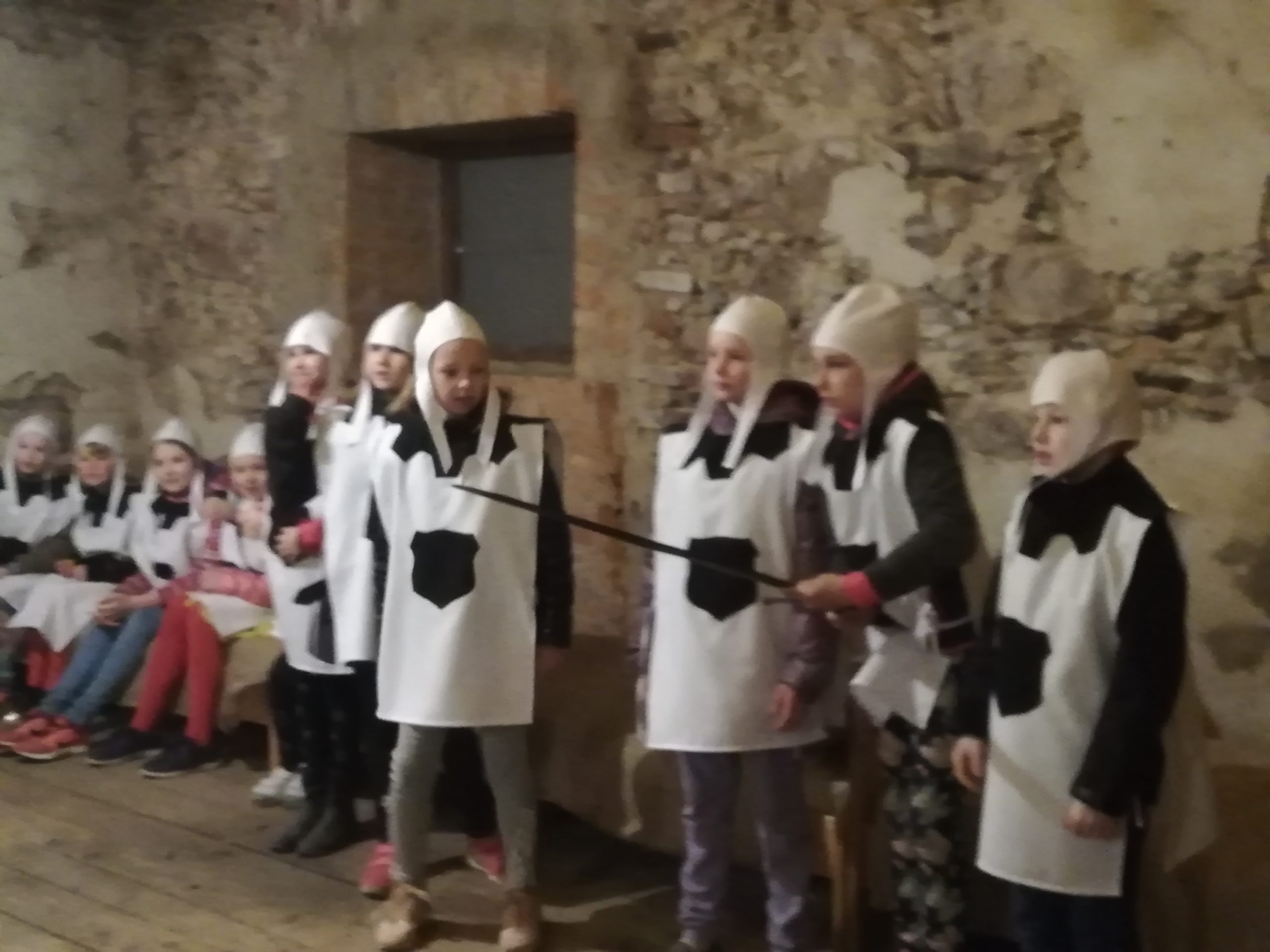 Mūks ar kalponīti izved bērnus mazo mūciņu tērpos cauri pilij, izspēlējot seno viduslaiku skoliņu, apgūstot iemaņas ieroču atpazīšanā un iemācoties tā laika pieklājības likumus.