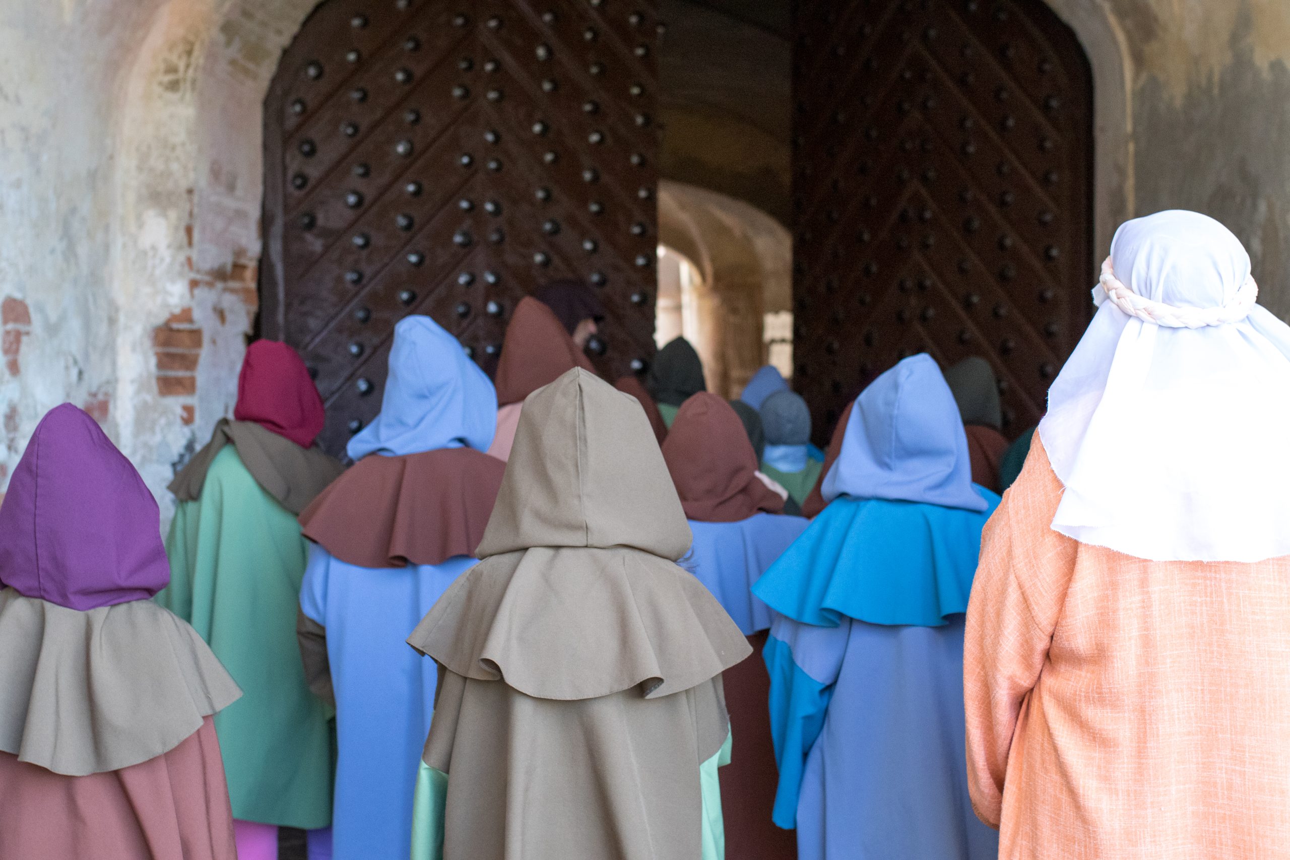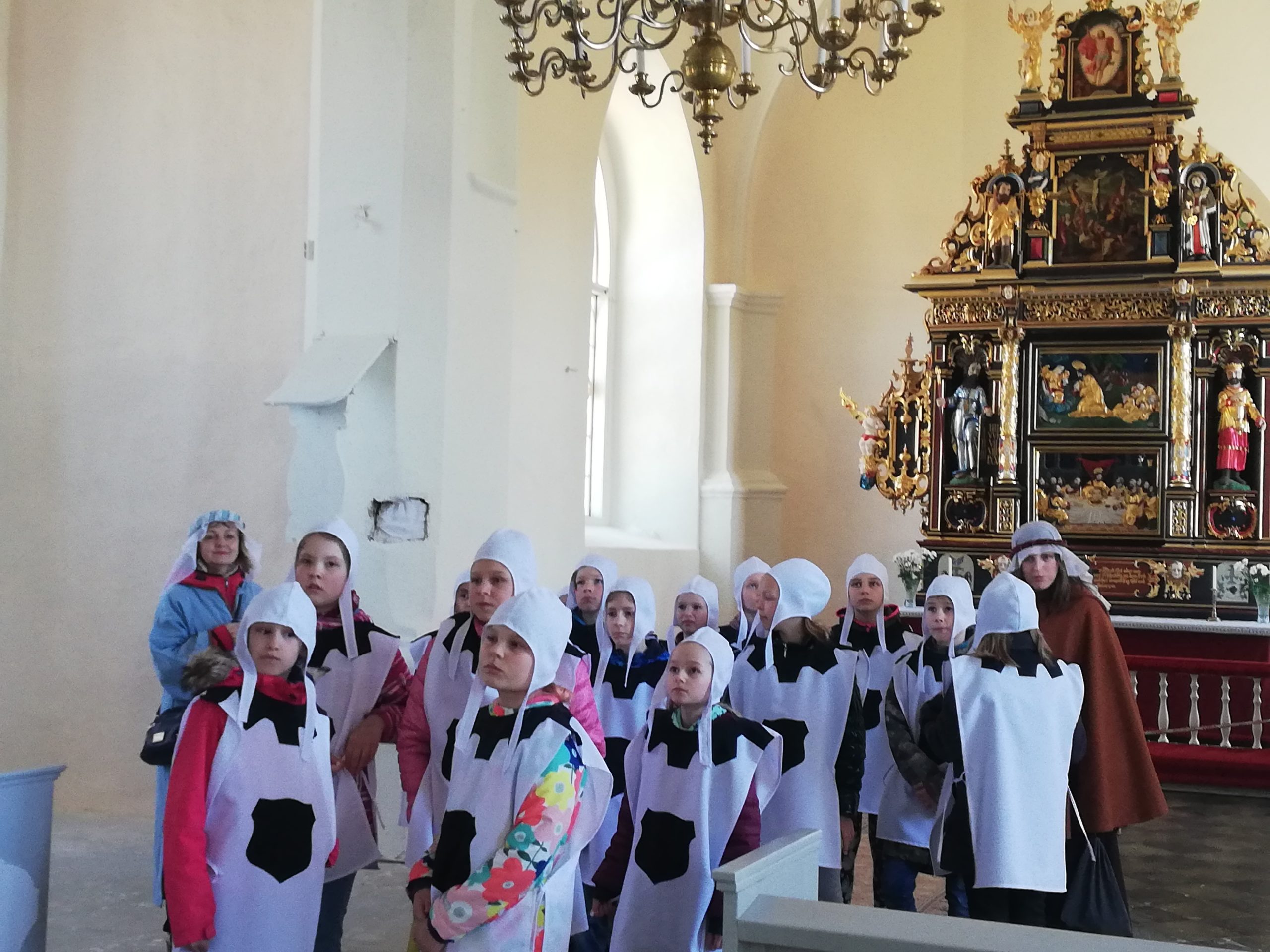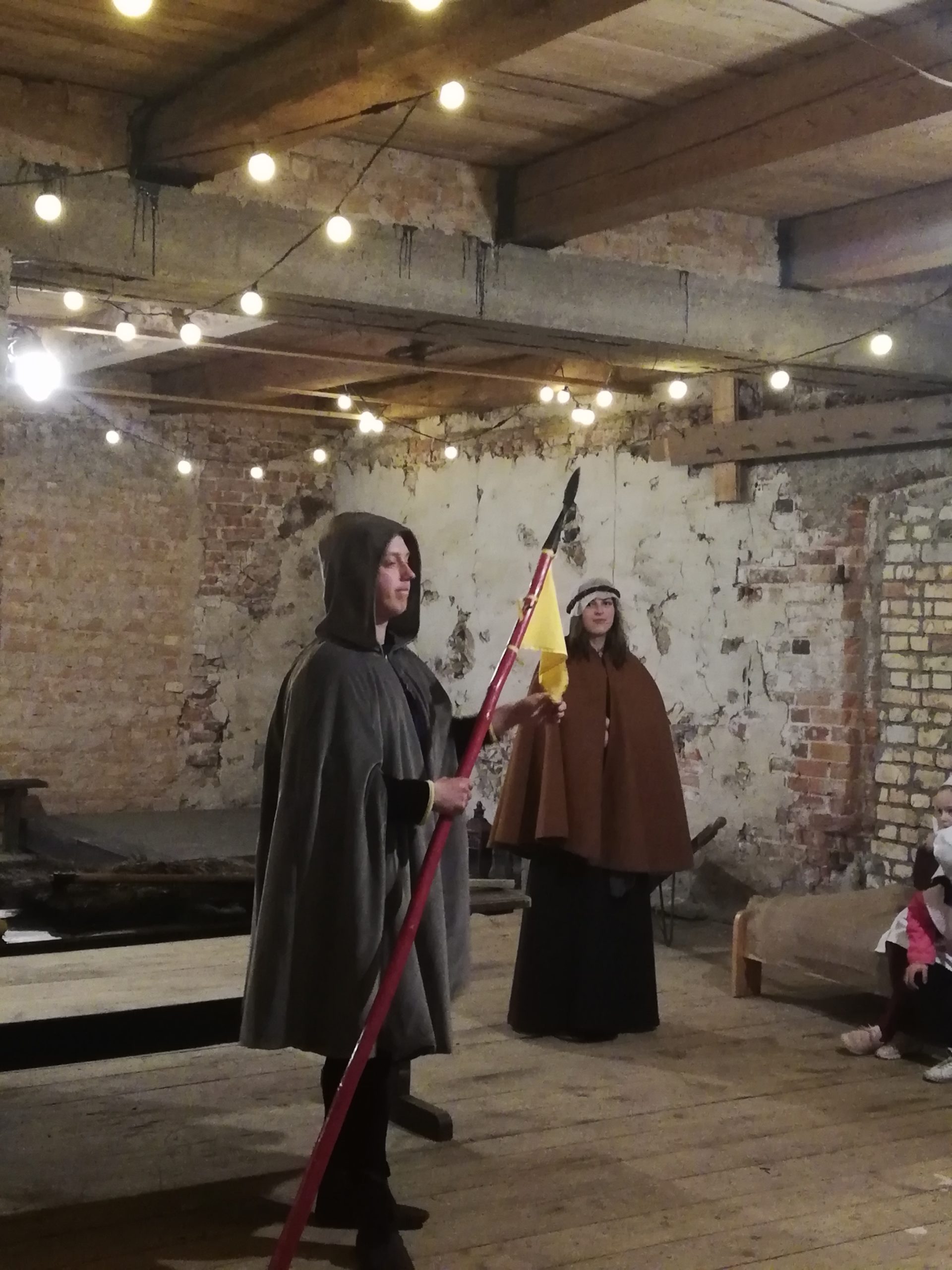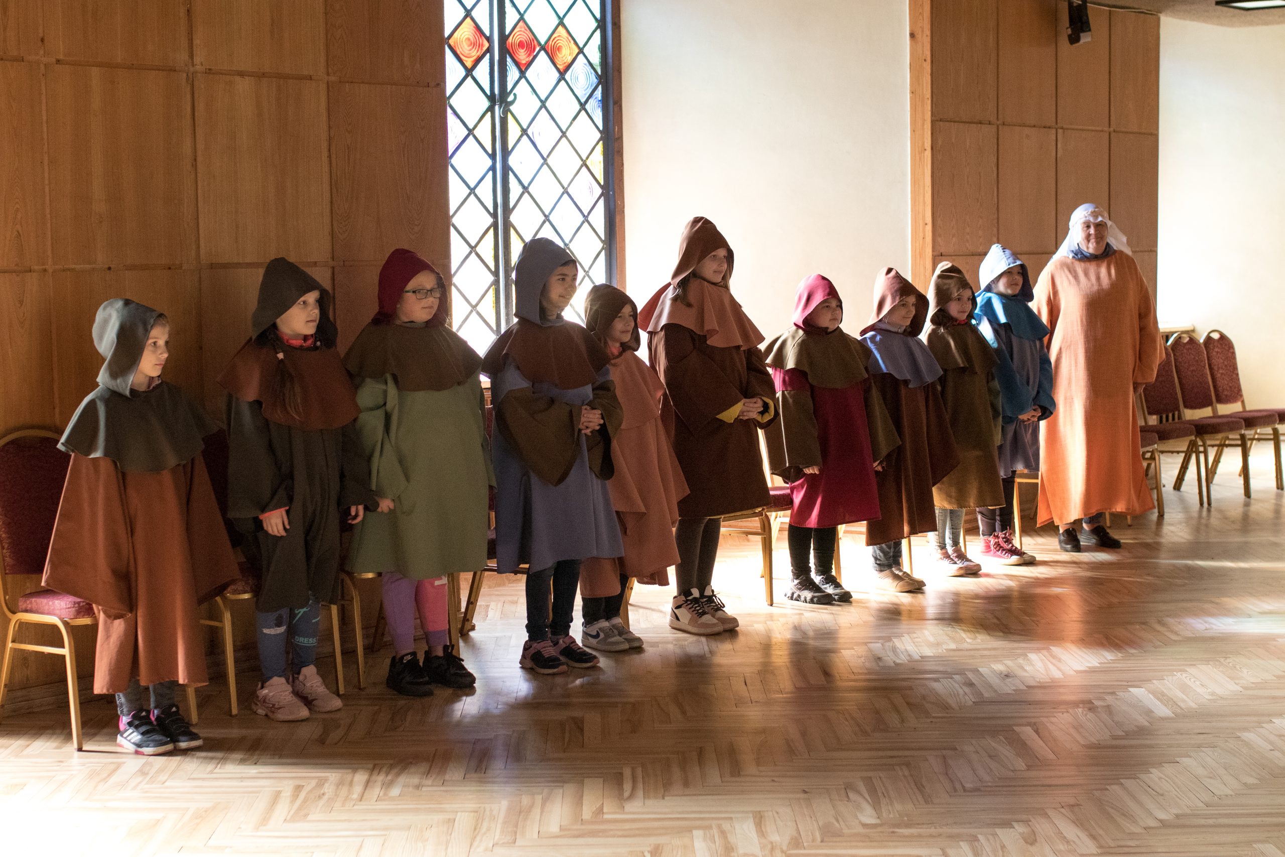 Mūks ar kalponīti izved bērnus mazo mūciņu tērpos cauri pilij, izspēlējot seno viduslaiku skoliņu, apgūstot iemaņas ieroču atpazīšanā un iemācoties tā laika pieklājības likumus.