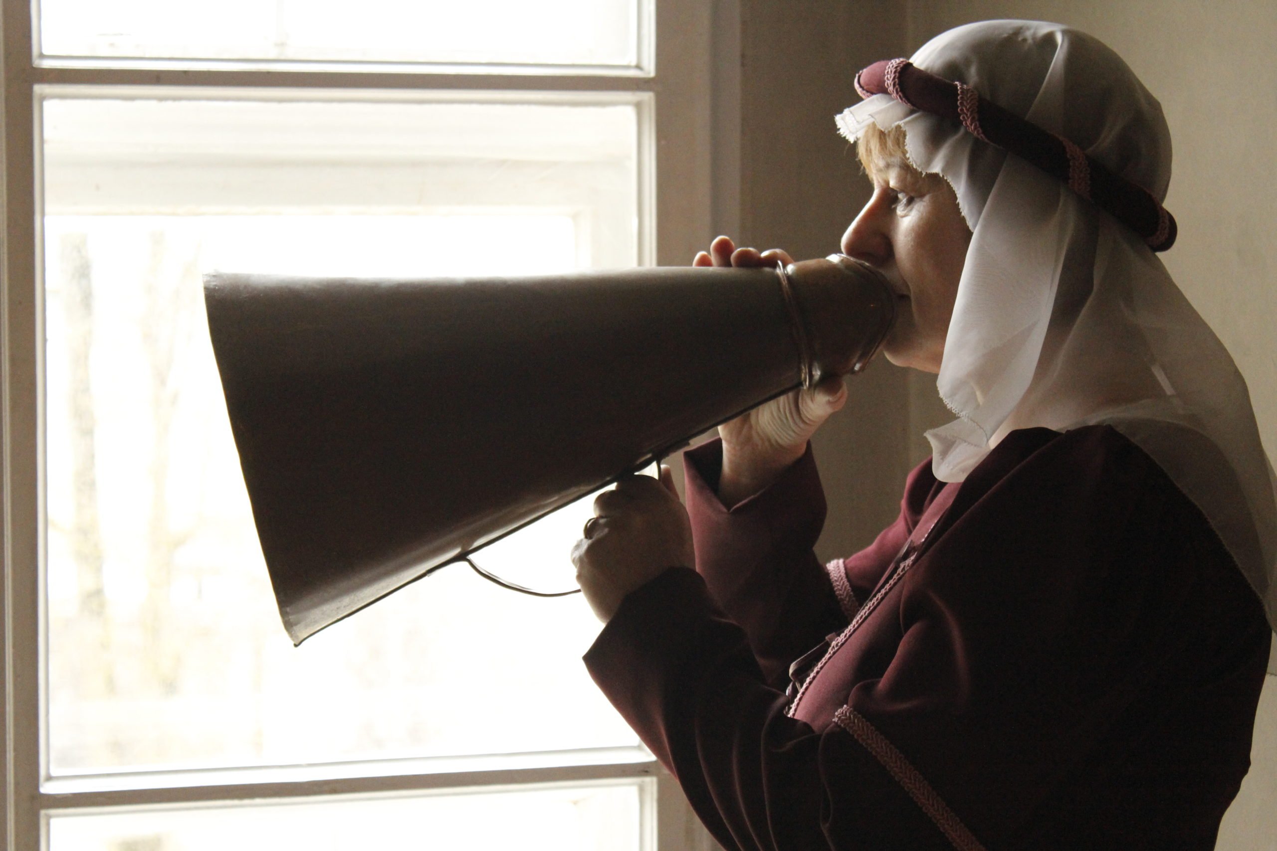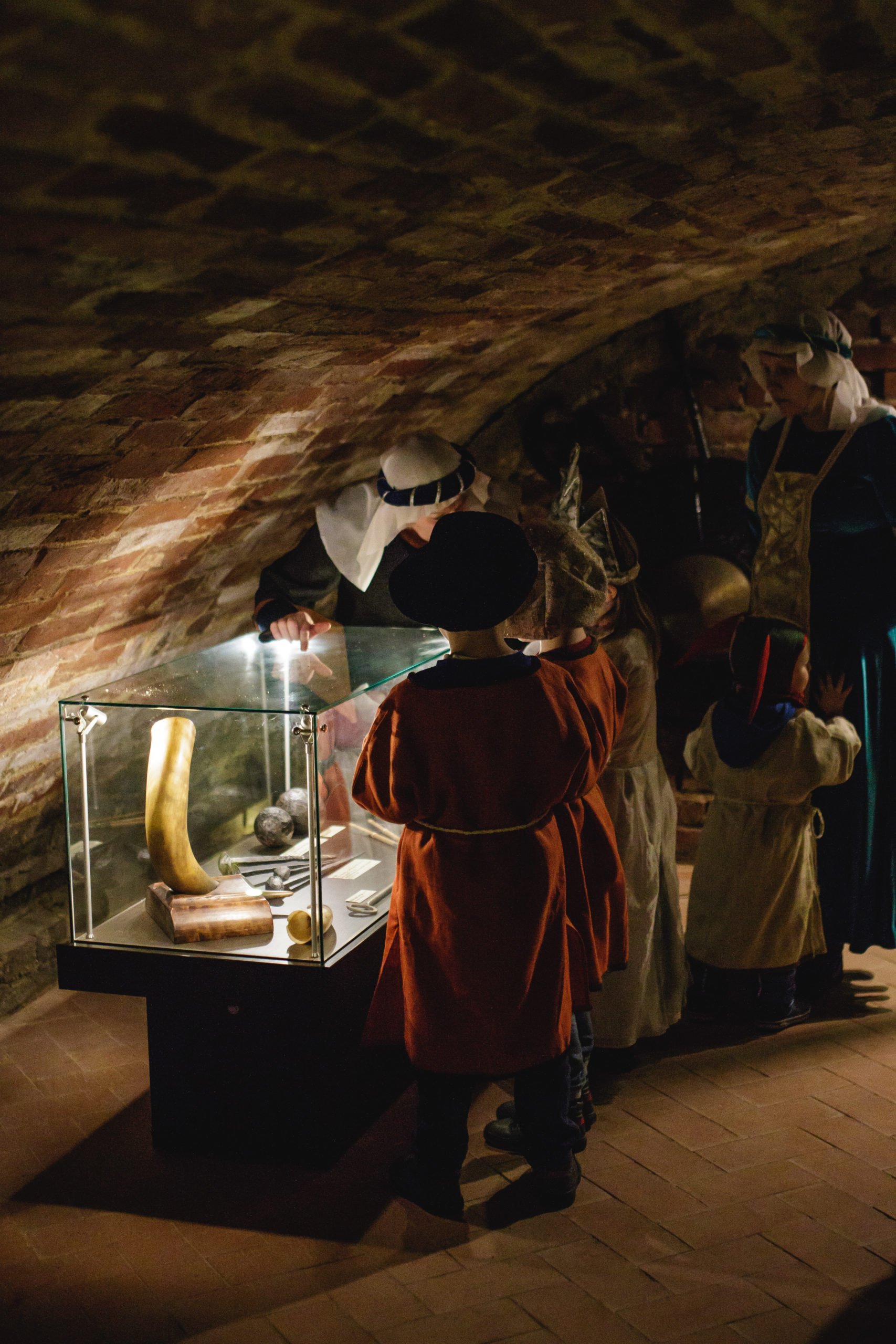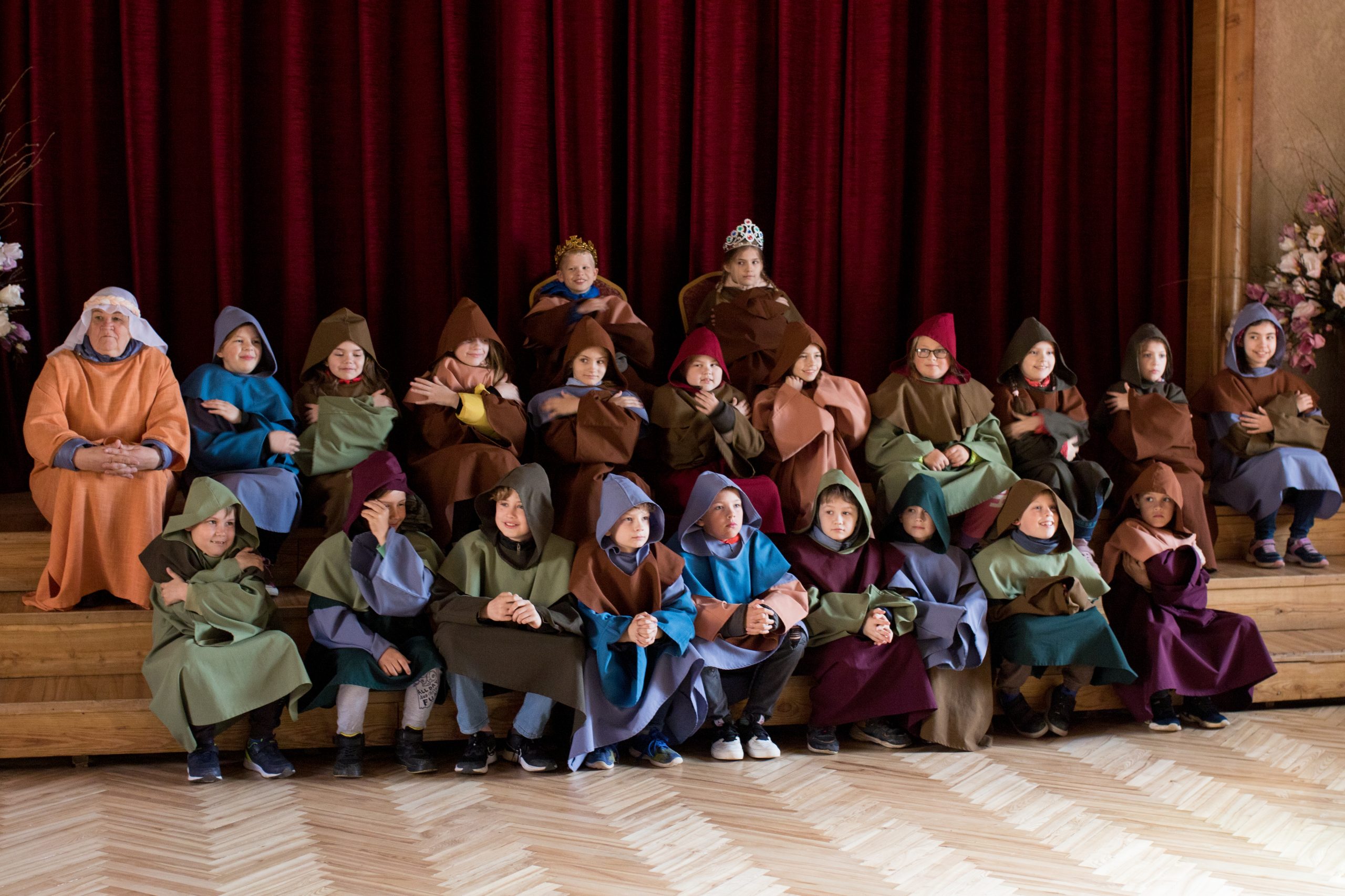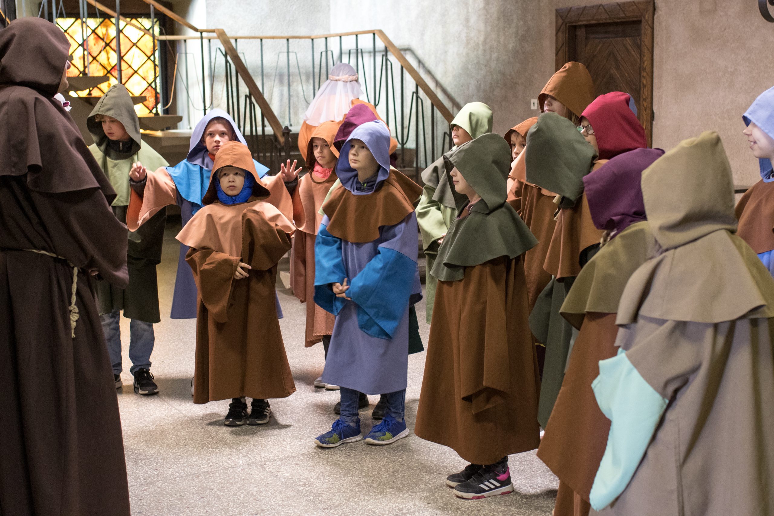 Mūks ar kalponīti izved bērnus mazo mūciņu tērpos cauri pilij, izspēlējot seno viduslaiku skoliņu, apgūstot iemaņas ieroču atpazīšanā un iemācoties tā laika pieklājības likumus.