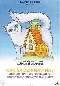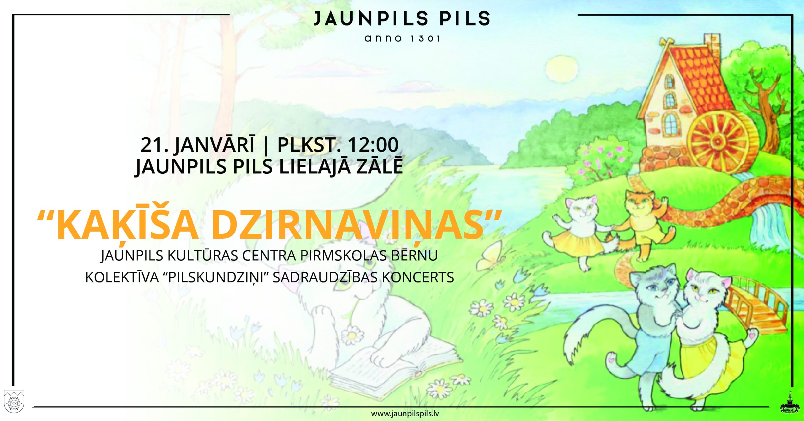 Jaunpils pils Lielajā zālē notiks Jaunpils Kultūras centra pirmskolas bērnu kolektīva “Pilskundziņi” sadraudzības koncerts “Kaķīša dzirnaviņas”.